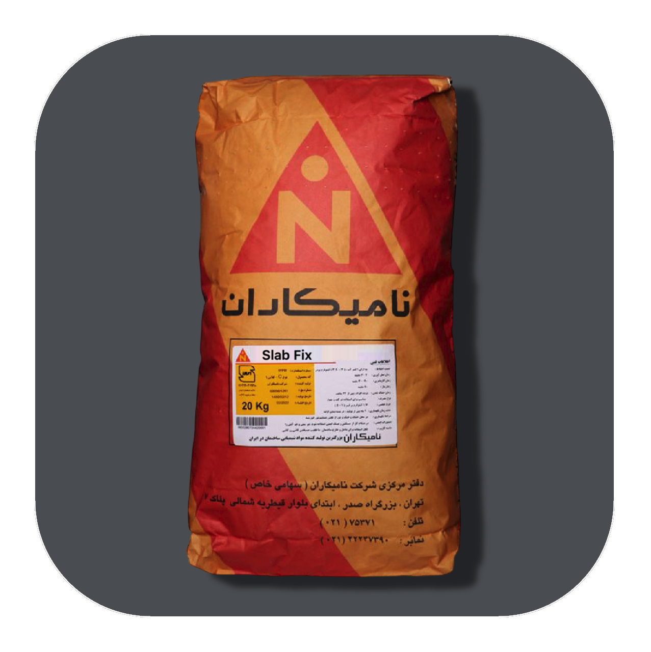 چسب کاشی Slab Fix تولیدی شرکت نامیکاران،، یک چسب کاشی پودری آماده مصرف است که ترکيبی از سيمان، افزودنيهای پليمری مختلف و ویژه ، پرکننده های معدنی و مسلح شده با الياف سلولزی می باشد که تنها با افزودن آب به آن، چسبی با قدرت چسبندگی و پيوستگی بسيار زیاد و مقاوم در برابر آب به دست می آید که برای نصب انواع اسلب های پرسلانی مناسب می باشد. این محصول مطابق با استاندارد ملی ایران به شماره 21421، نوع C (کلاس C2TE-S2) و همچنين 12004-1 EN DIN می باشد.